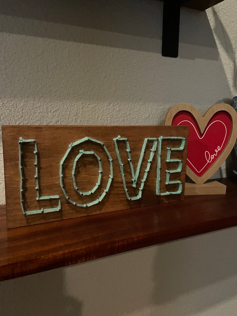 This month’s craft at work was a “Love” wooden sign made with nails and yarn. I think it came out so cute!