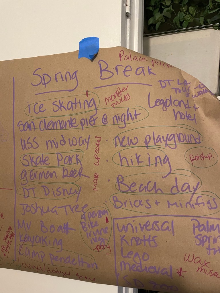 We also did a little brainstorming session this month which I really enjoyed. We are not doing a major trip for Spring Break this year, so instead I put up a big piece of butcher paper on our closet door, and told the kids to go wild with anything and everything they’d like to do. We have some great ideas that we winnowed down between things we can plan for spring break, things we can plan for future family trips, and things we can aspire for…someday, ha!