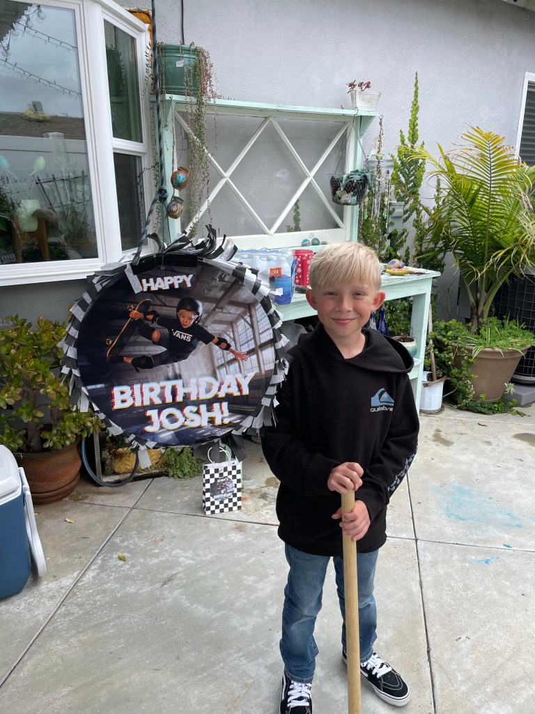 One tradition we started in 2020 with COVID that has stuck around (sometimes, based on the theme) is making our own pinatas! I didn’t find anything great online that was on-theme, so with dad’s help, we made our own! Jeff designed an amazing invite, so we used that image for the pinata. There wasn’t a large enough print at FedEx, so Jeff cut the image in two, we printed two copies of each page, and then cut and glued them on to the pinata that Jeff fashioned with Amazon boxes. Bought some black and white tissue paper, and voila!