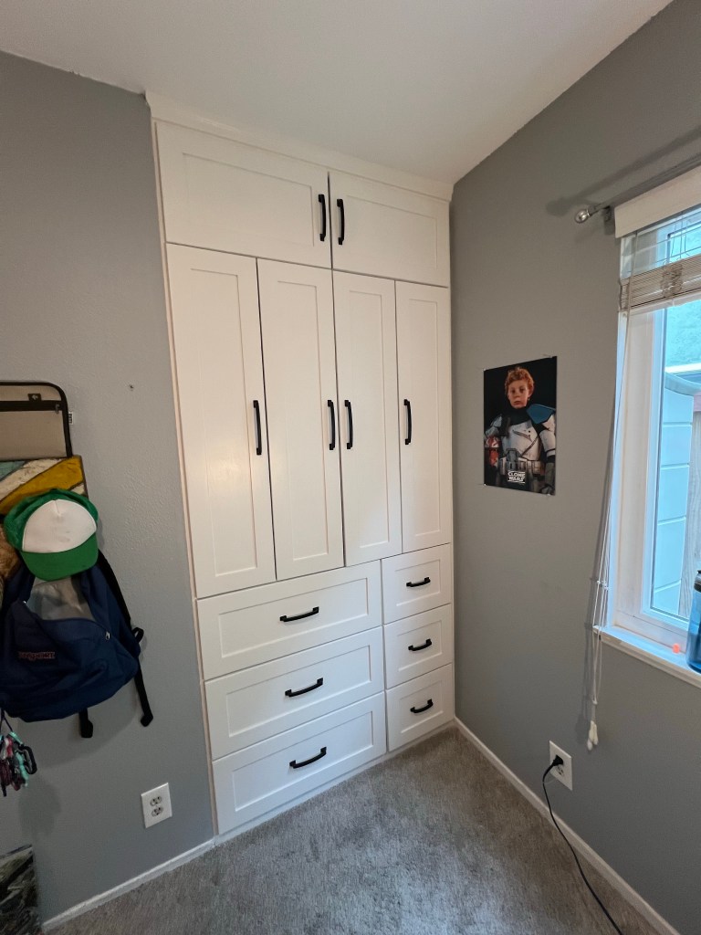 Our other big home project has been the built-in closet that Jeff has made for Jake’s bedroom. It’s been a very time-consuming project, but Jeff has done an AMAZING job.