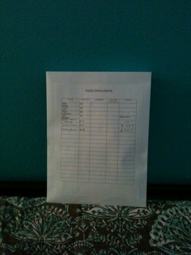 As you may or may not remember, my initial goal was $1,000, and the current total stands at $574! Not bad, huh? So in order to keep track of donations, to ensure that I send out Thank-you’s to all you generous souls and I know how much has been raised, I started an envelope where I can keep cash, checks, etc., and posted a chart on the front with table for information. It looks a little like this:
