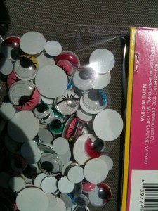 SO, HODR has a wish list of items they need down there. The first paragraph is art supplies, and the rest is construction stuff, like drills, nails, clamps, boat cutters, etc. I would love to be able to get these construction items and bring them down, since I’m sure they’re much more helpful than colored pipe cleaners or crayons….but how the heck am I supposed to carry that stuff over there?! So I went with the art supplies…and one item requested was googley eyes. Mind you, the 99 cent store had regular googley eyes, but I also couldn’t pass these up: