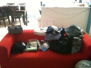 It only got worse once I pulled the coffee table out of the way and I pulled out every article of clothing I wanted to bring. I figured if it didn’t fit, then I would scale down what I’m taking..
