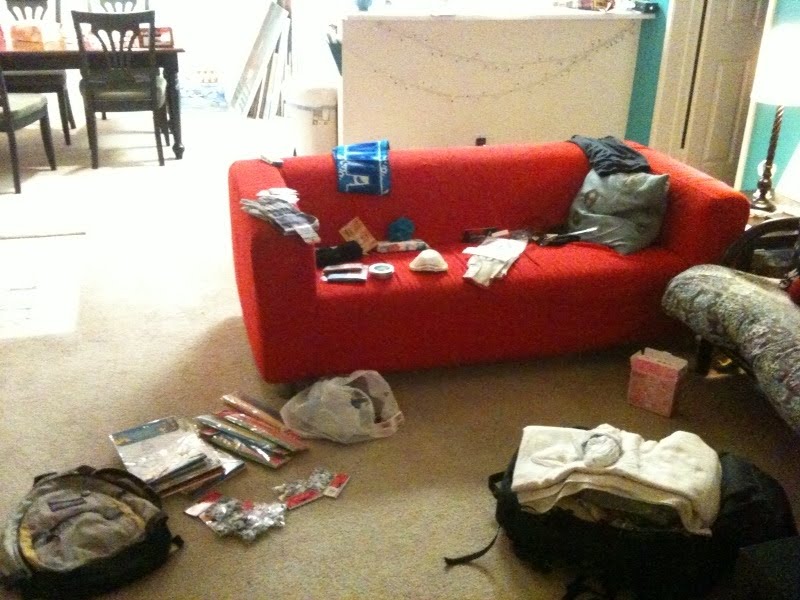 So this is it! The last couple weeks I was basically keeping piles of plastic bags in the corner of my dinning room, with whatever stuff I had just bought for my trip. Last night I finally started to put everything in one big pile, and taking things out of shopping bags. This is what my couch looked like this morning: