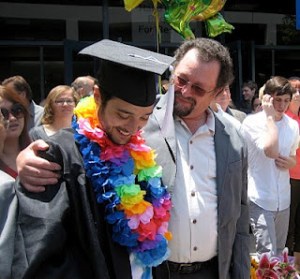Fast forward past the procession into the stadium, all the graduates taking seats, Erika, Brooke and I clumsily trying to get some close up pictures of Julian…finally settling into our seats for the next hour or so of speeches. I wonder what Julian is thinking, other than ridiculously happy and proud of himself! And aside from being annoyed with the chosen student speaker (I might save that for another blog entry). All I know for sure is that he could see the happiness and pride we all felt for him. Including his dad:
