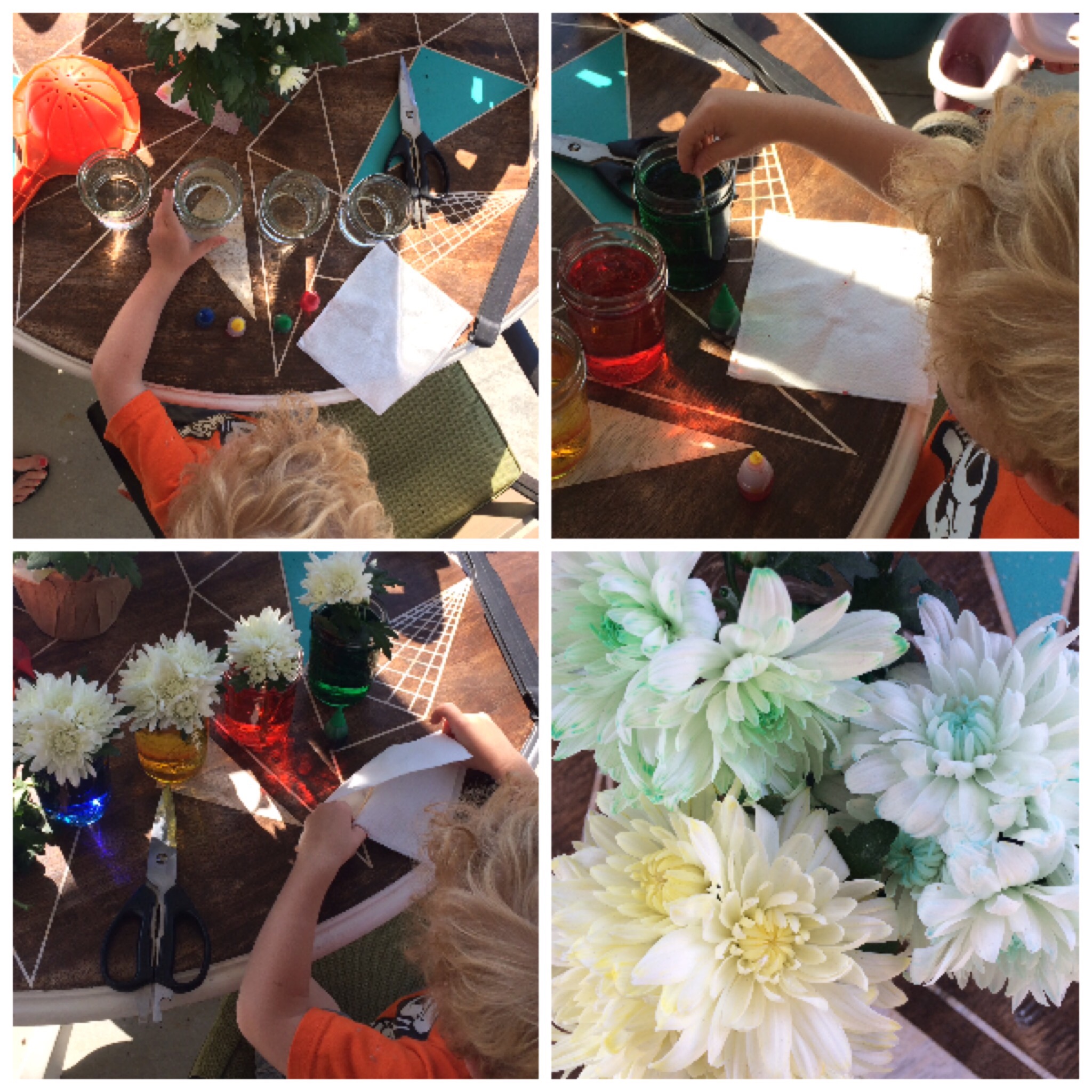 Thanks to those Pinterest boards, we tried a few different science experiments, like using food coloring on flowers. This one took days and days and days for the dye to kinda sorta make it’s way through, but Jake seemed pretty excited to check the progress every day and would not let me throw the flowers away until they were REALLY dead.