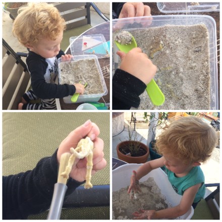 What kid doesn’t love dinosaur fossils?! This idea I copied from a friend who did a dinosaur theme for her daughter’s birthday, and had buckets with sand and fossils for the kids to dig through. I decided to replicate this and try it at home. I even found some mini-magnifying glasses to complete the look. Um, I have a ton of those still if anyone wants them. Disclaimer: many of these projects were fun and gave the boys (mostly Jake) something to do, but I’ll be honest: the time and effort to prepare for some of these was way more than the time it kept him entertained. I think they were all still worth it since it gave us something to do and I do think he enjoyed them, but just wanted to give the full disclosure that these aren’t activities that took up a whole afternoon (or even a whole hour).