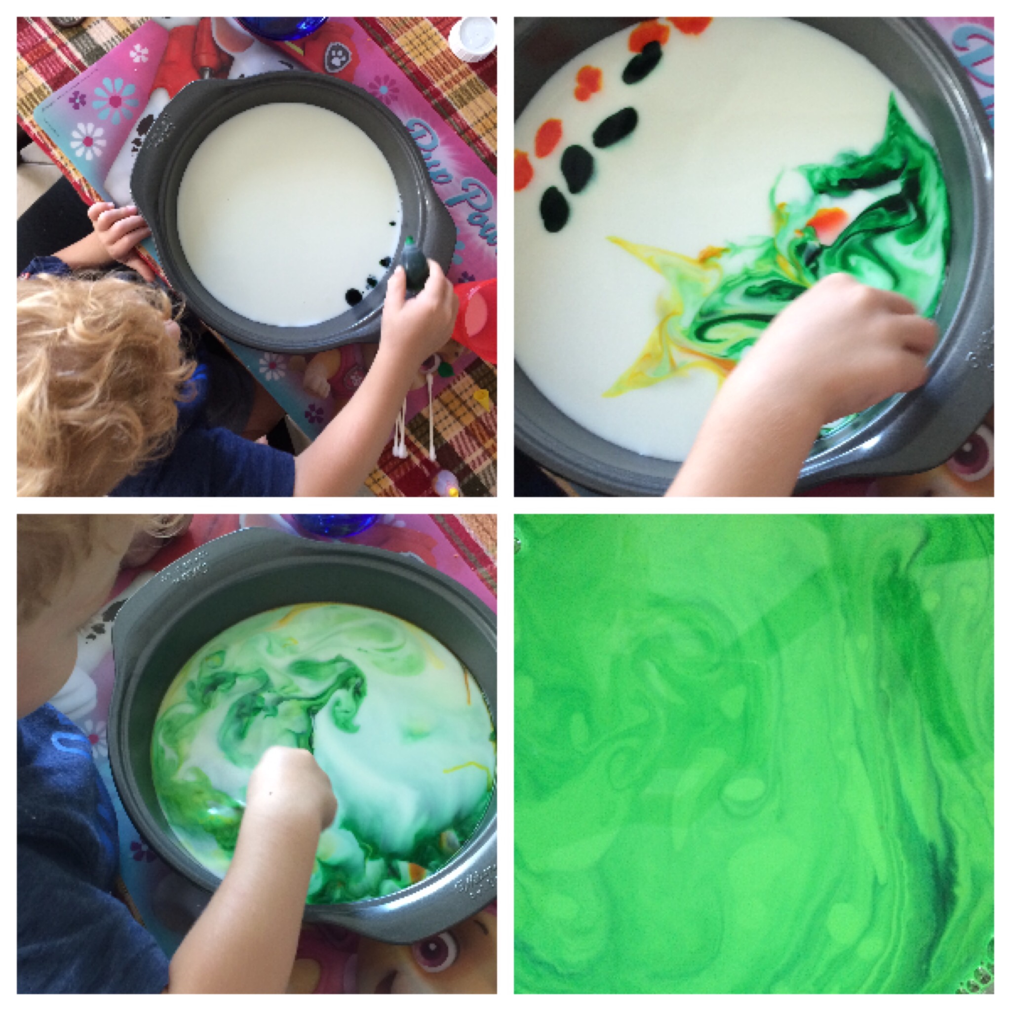 Milk, food dye, q-tips, and hand soap! Eventually this will be good to learn how mixing some colors makes new colors, but for now it was just fun to mix them all together and make reeeeeeeally green soapy milk…