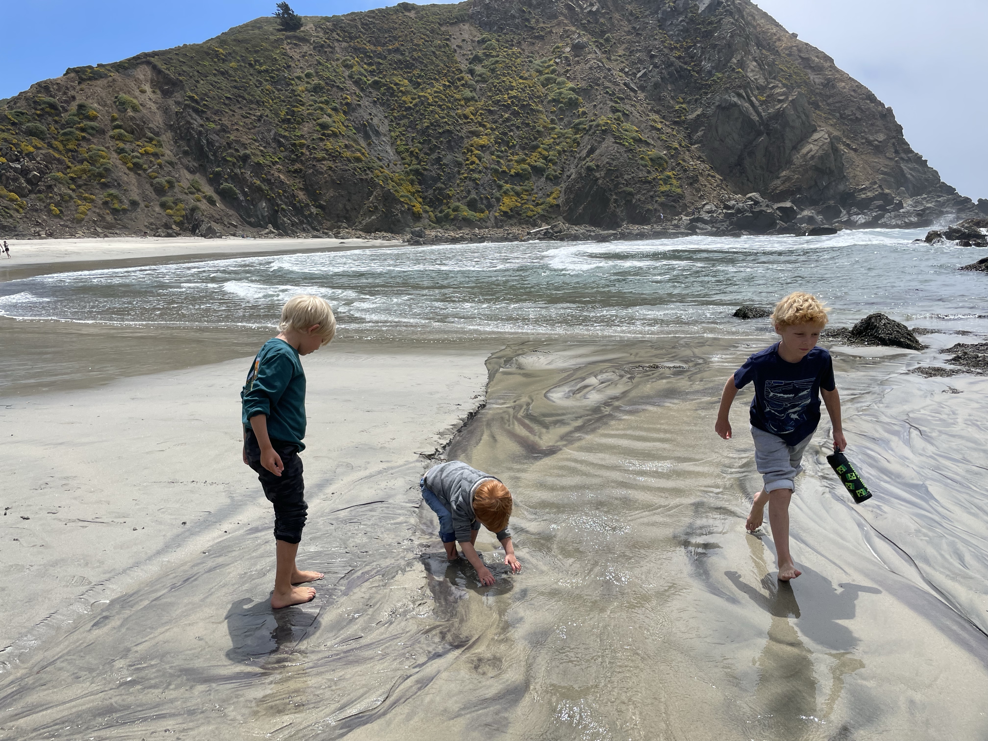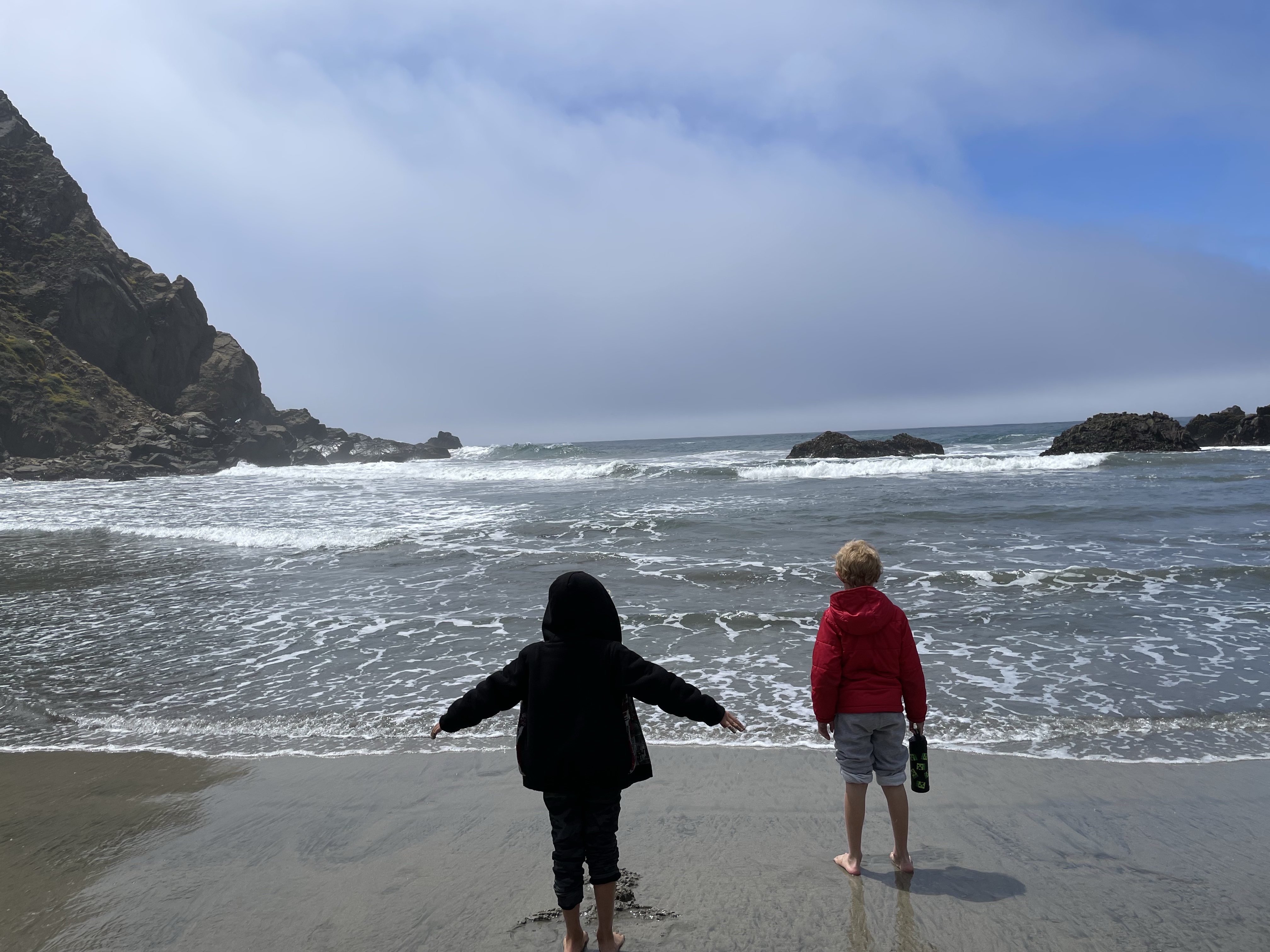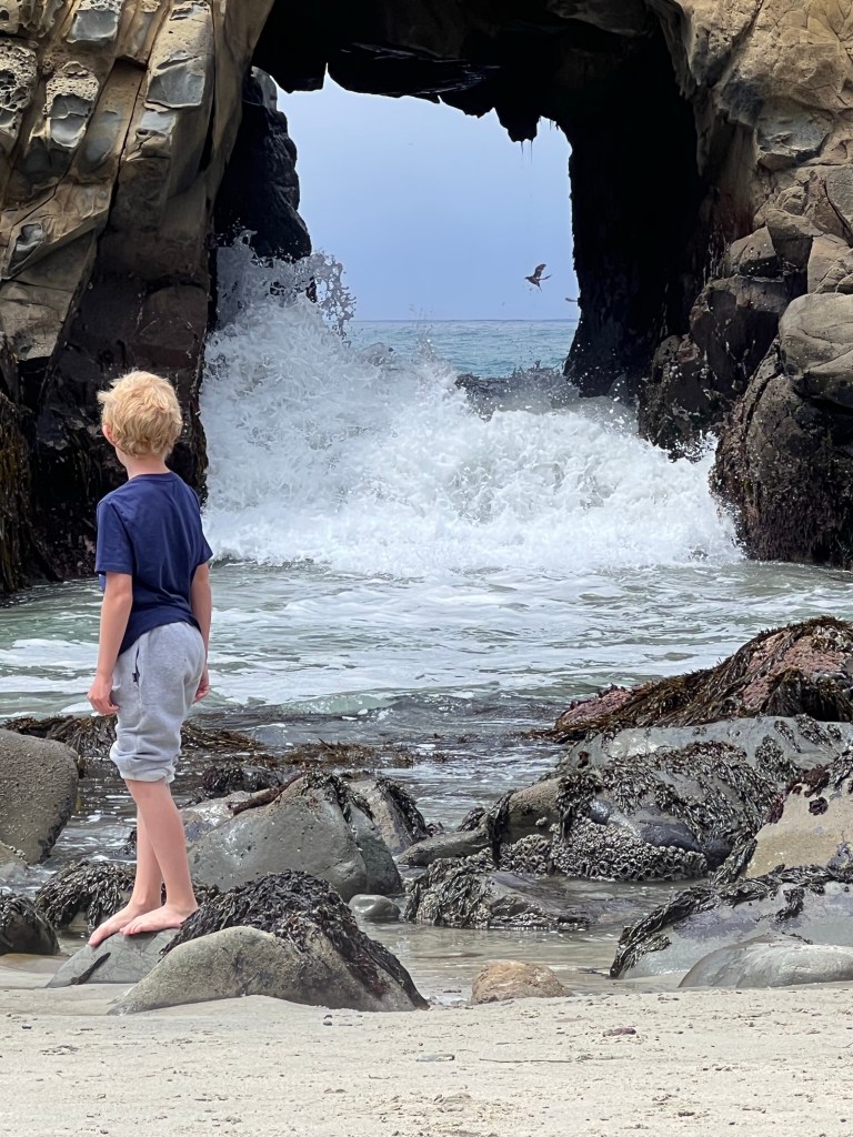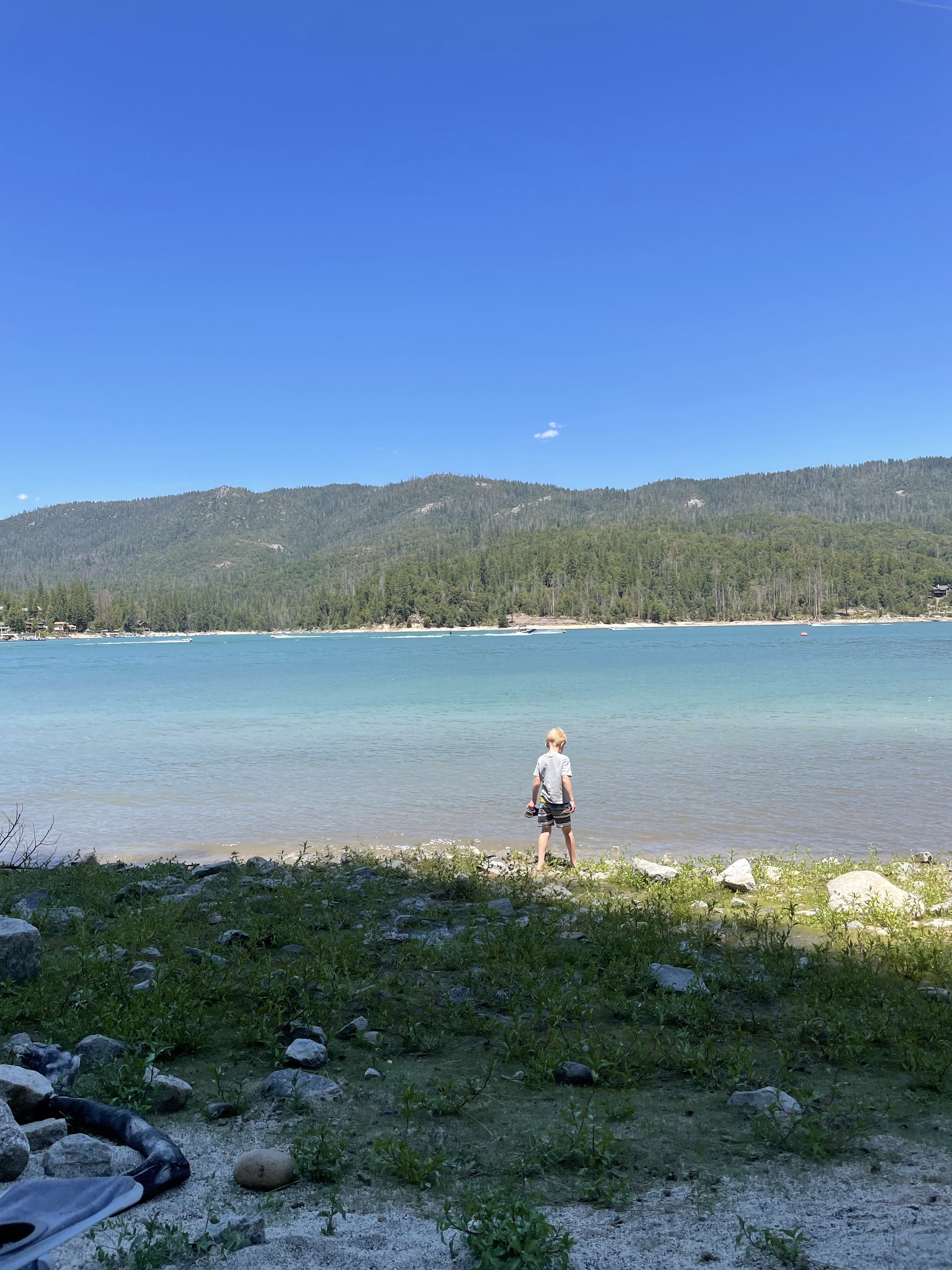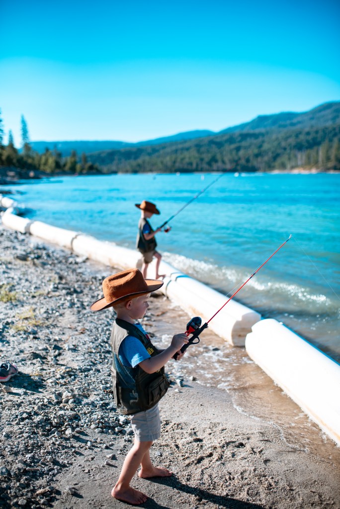 We headed back towards June Lake, and again: we were at a loss as to where to do any effective shore fishing around the lake, so we decided to just go to the beach. Parking is $10 for the beach access. We had brought our chairs and packed a lunch, but didn’t have any sun cover, so we were happy to have cloud cover for most of the time we were there. The boys waded into the water and took turns coming out to eat their sandwich (which we had to eat quickly before some weird gnats got on them, ha!).