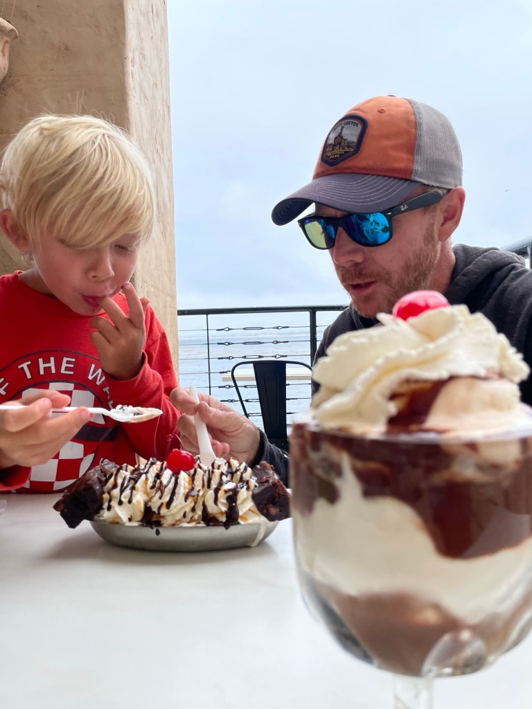 We decided to ease our disappointment with ice cream, and headed to Hugs in the Mammoth Village. I really appreciate when there’s a combo of unique flavors (like strawberry melon and banana chocolate chip) and regular flavors (chocolate chip, chocolate, vanilla). Our kids are always a little let down when they’re excited for ice cream and all the flavors are funky flavors. Jeff really enjoyed the banana chocolate chip, and Jake was a huge fan of the strawberry melon. I think Jonny got chocolate and I got chocolate chip – both were great.